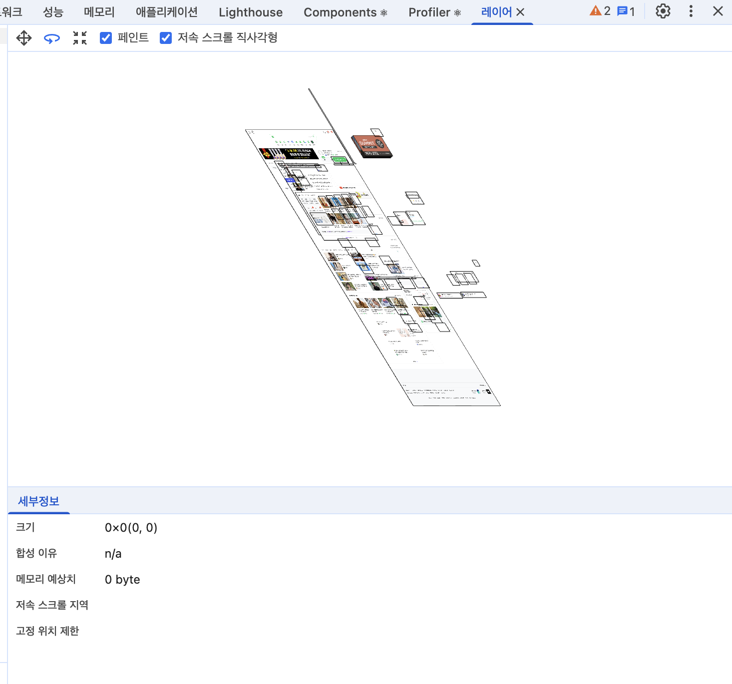 레이어도 개발자 도구에서 확인할 수 있습니다. 아래 사진과 같이 레이어가 쌓여 있는 것을 확인할 수 있습니다. 과도하게 많은 레이어는 작업 속도를 느리게 만들기 때문에 애플리케이션의 렌더링 성능을 측정하여 관리하는 것이 중요합니다.