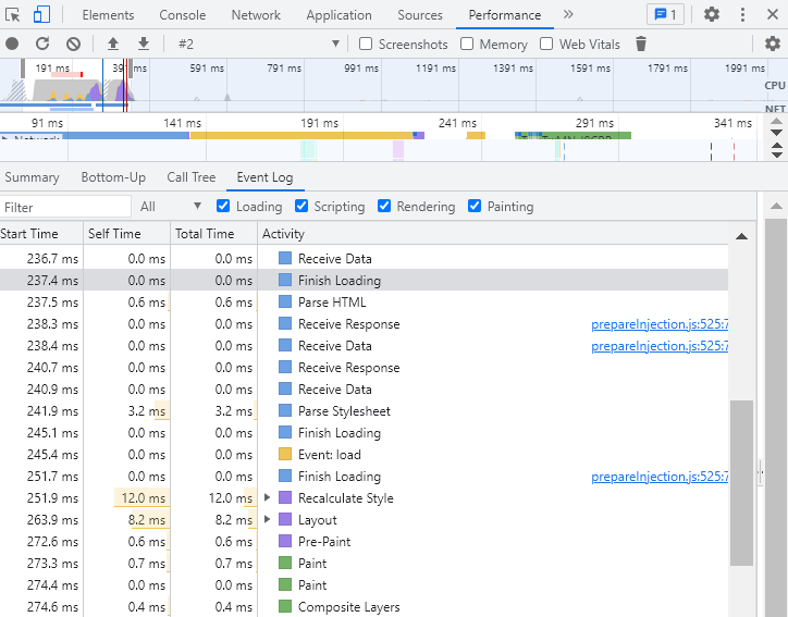 CRP(Critical Rendering Path)을 개발자 도구 성능 탭에서 확인해 볼 수 있습니다.