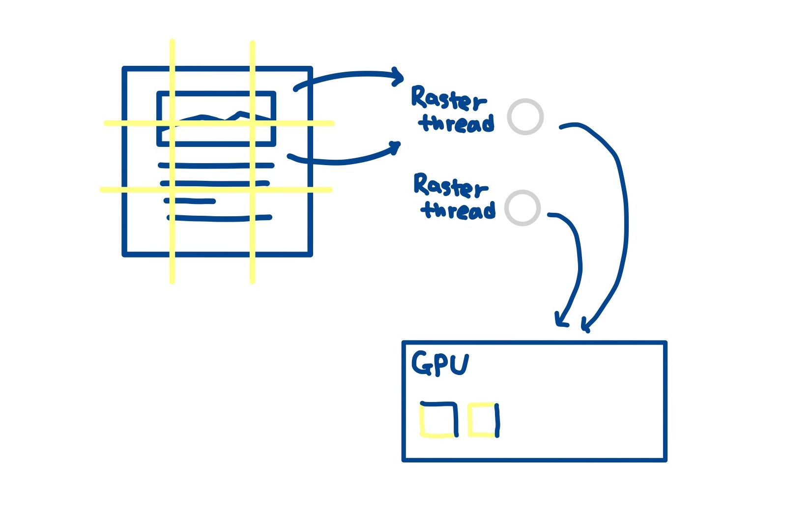 레이어 트리가 생성되고 페인트 순서가 결정되면 메인 스레드는 이 정보들을 합성 스레드에 커밋합니다. 다음으로 합성 스레드는 각 레이어를 픽셀화하고, 타일로 나눕니다. 이 타일은 래스터 스레드로 보내진 다음 래스터화되어 GPU 메모리에 저장됩니다. 합성 스레드는 커밋 받은 레이어를 쪼개어 래스터화하고 프레임으로 만들어서 GPU에 전달하는 역할을 수행한다고 생각하면 됩니다.
