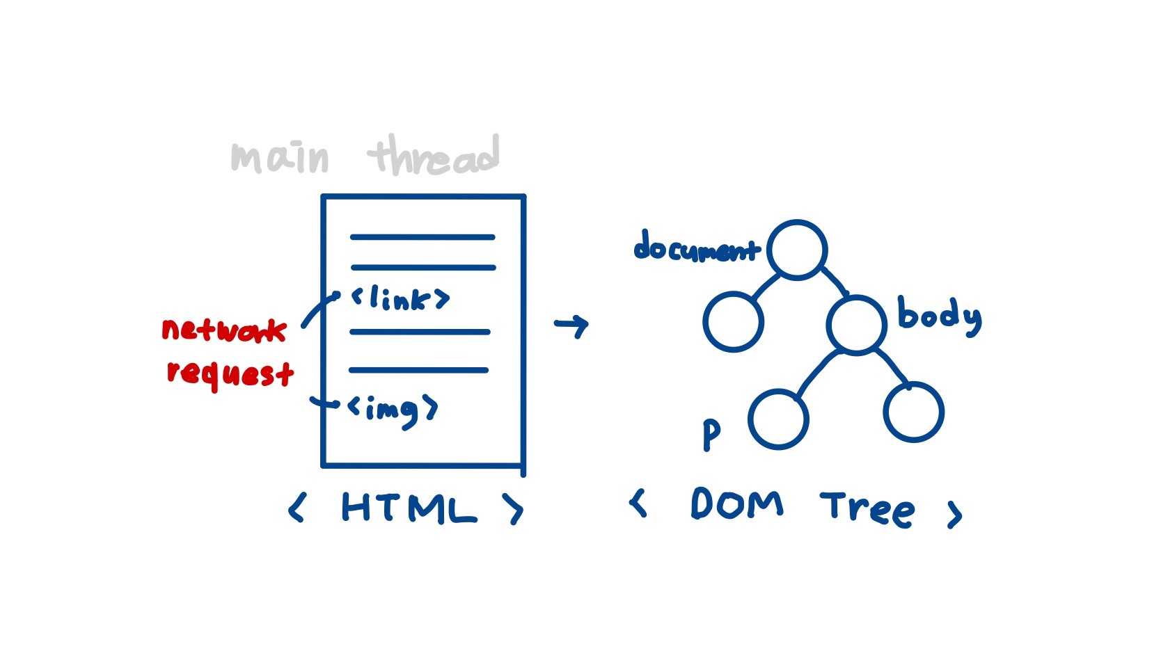 파싱은 <link>, <img>, <script> 태그를 만나면 중단됩니다. 보통 브라우저는 외부 리소스인 이미지, 자바스크립트, CSS를 사용하고 있는데 이는 네트워크나 캐시로부터 가져와야 하기 때문이죠.