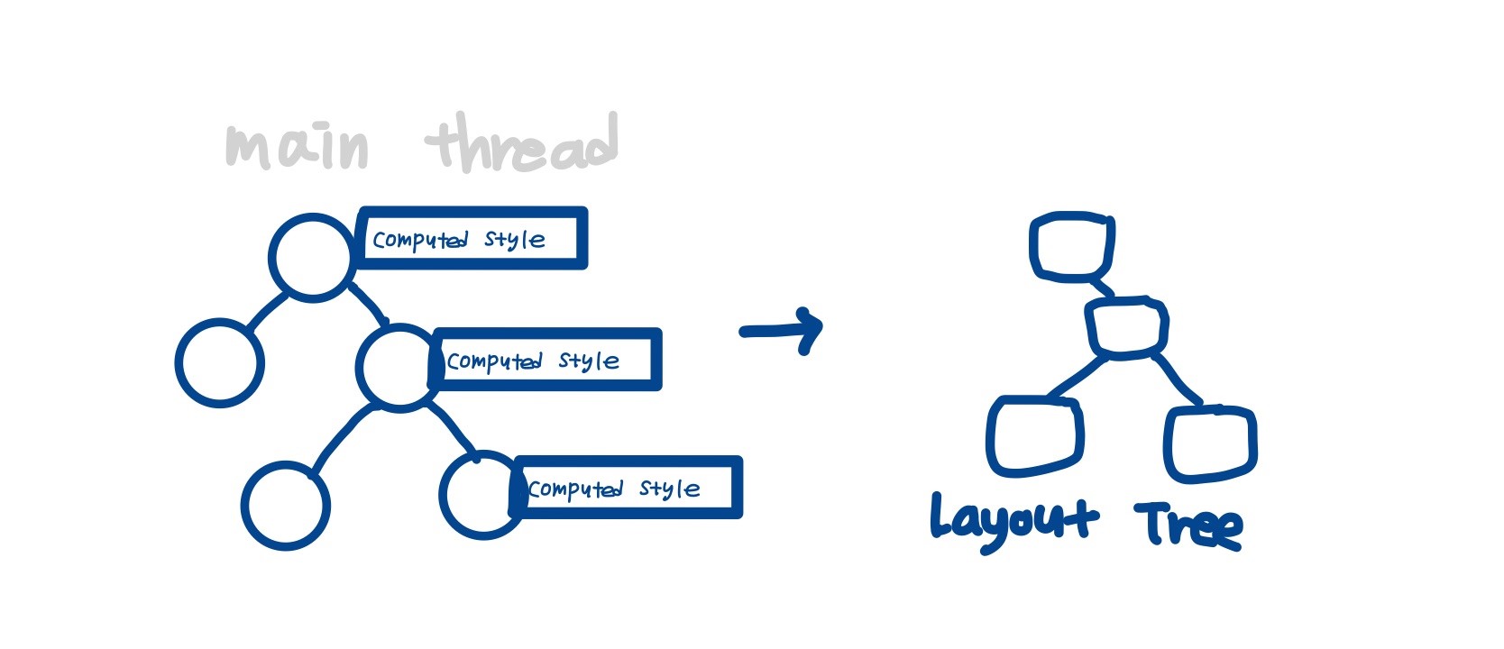 메인 스레드는 DOM과 계산된 스타일을 통해서 레이아웃 트리를 생성합니다. 레이아웃 트리는 x y좌표나 크기 같은 정보를 가지고 있습니다. 그러나 오직 화면에 렌더링 되는 노드만으로 구성되기 때문에 display:none가 적용된 노드, <meta>, <script> 같은 노드는 포함되지 않습니다.