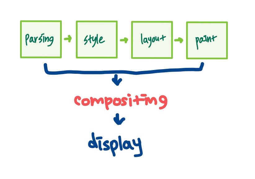 이제 HTML 구조, 각 요소의 스타일, 페이지의 기하학적 속성 등을 통해서 페이지에 그려야 합니다. 이 정보들을 픽셀로 변환하는 과정을 픽셀화(rasterzing)라고 합니다. 그러나 최신 브라우저에서는 합성(composition)이라는 과정을 거칩니다.
