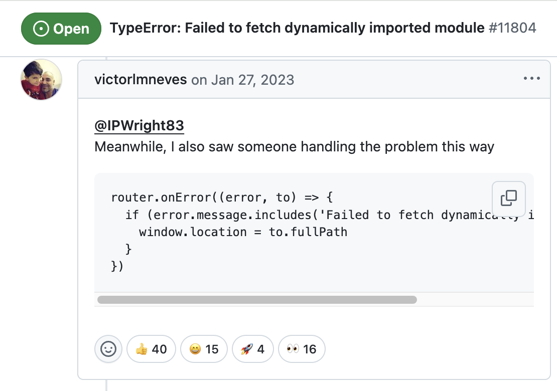 특히 웹뷰 환경에서는 사용자가 배포 이전 버전의 페이지를 계속 참조하고 있어, 더 이상 존재하지 않는 모듈을 요청하는 경우가 빈번했다. 따라서 앱을 다시 재접속해야 하는 불편함이 계속해서 뒤따랐다. 현재는 해당 에러 발생 시 페이지 새로고침으로 임시 대응하고 있다. 하지만 이는 새로 고침을 하면서 발생하는 화면 깜빡임과 상태 초기화를 동반하여 예기치 않은 부작용을 초래할 수 있어 우려가 되었다.
