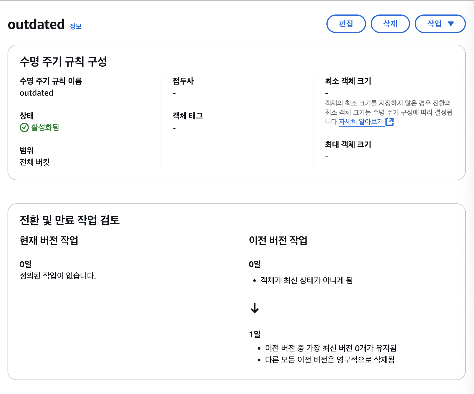 객체의 만료 시점을 정의할 수 있는데 S3는 버킷의 상태에 따라 만료 처리 작업을 한다.