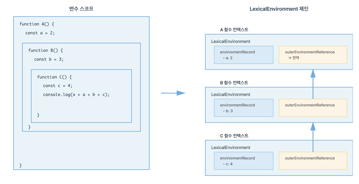 초기에는 VariableEnvironment와 같지만 변경 사항이 실시간으로 반영된다는 차이가 있다. 스코프와 변수를 관리하는 핵심적인 개념이며, 변수와 함수의 유효범위를 정의하는 구조다.