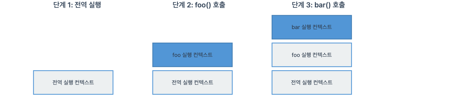 foo(); // 6이 코드가 실행될 때 실행 컨텍스트들이 콜 스택에 차례로 쌓이게 된다. 전역 컨텍스트가 먼저 생성되고, foo 함수가 호출되면 foo의 실행 컨텍스트가 생성되어 스택에 푸시된다. 그리고 bar 함수가 호출되면 bar의 실행 컨텍스트가 또 스택에 푸시된다.