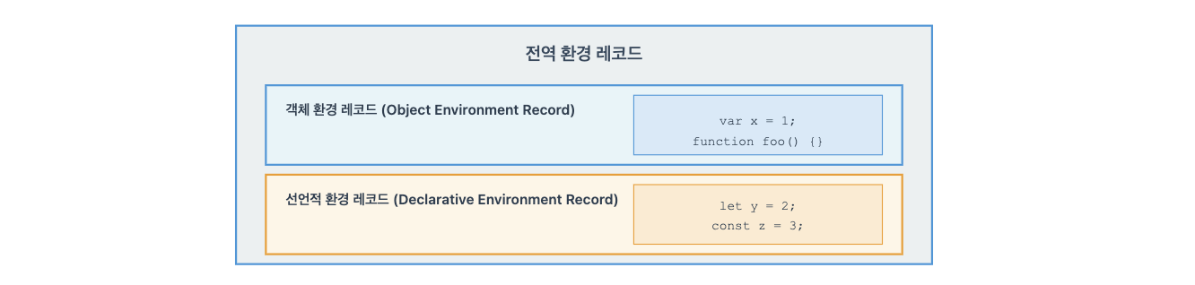 선언적 환경 레코드: let, const 키워드로 선언한 전역 변수를 관리한다.