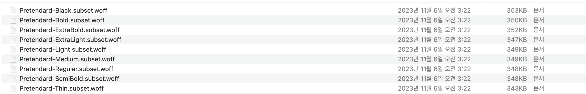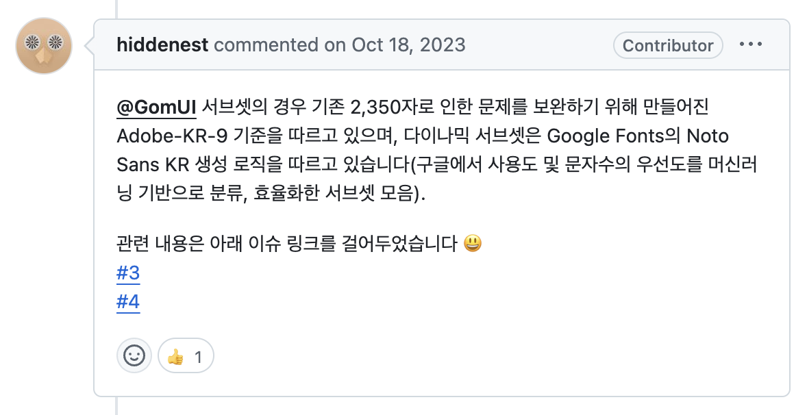 서브셋 폰트와 다이나믹 서브셋 중 어느 방식을 선택할지 고민했는데, 다이나믹 서브셋의 경우 페이지를 이동할 때마다 사용된 글자에 맞는 폰트 파일을 다운로드하게 되어 과도한 네트워크 호출이 발생할 수 있고, 이는 성능 저하로 이어질 수 있다는 점이 염려되었다. 따라서 서브셋 폰트로 최적화하기로 했다.