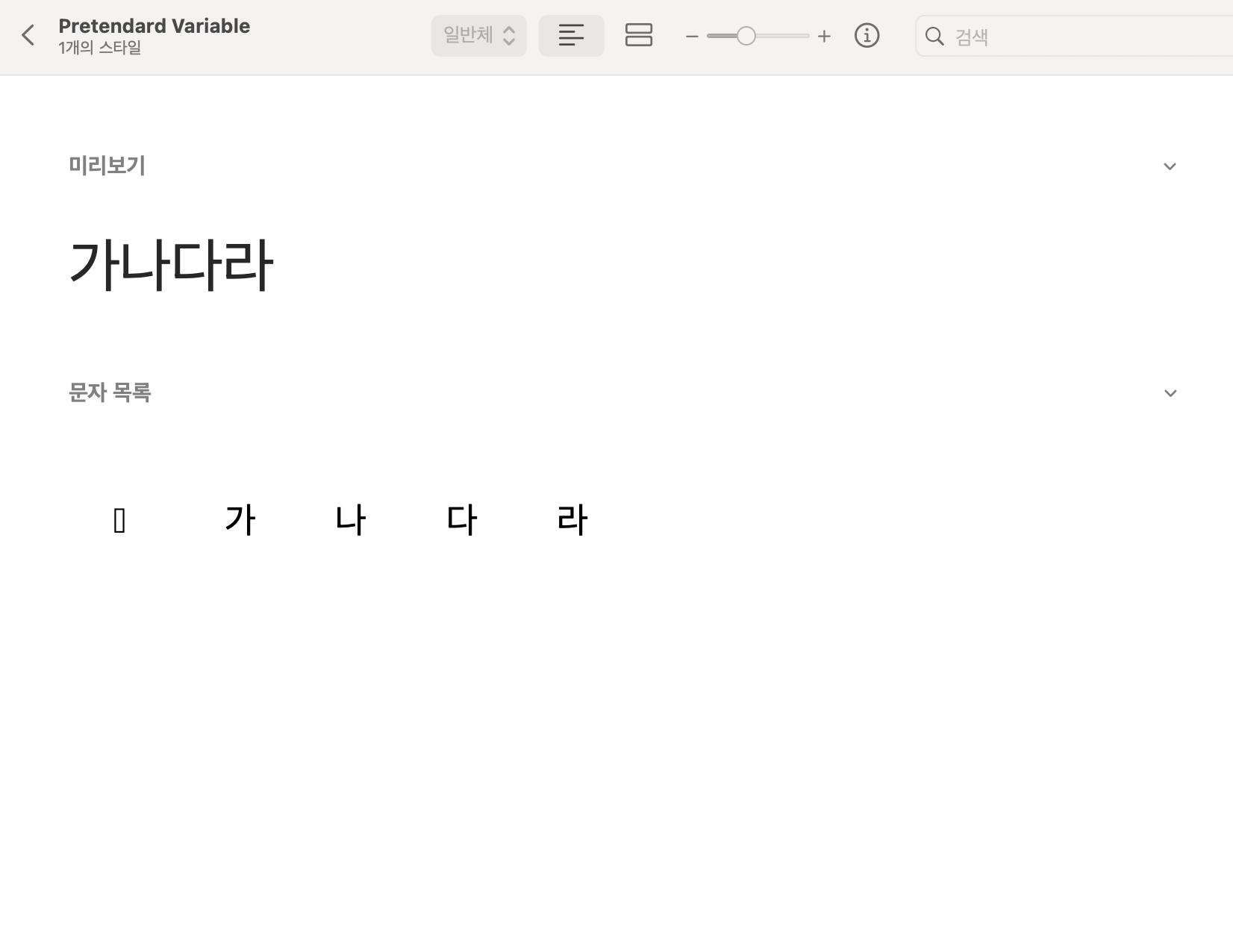 이렇게 생성한 서브셋 폰트 설치 후 확인해보면 ‘가나다라’ 글자만 지원하는 것을 확인할 수 있다.