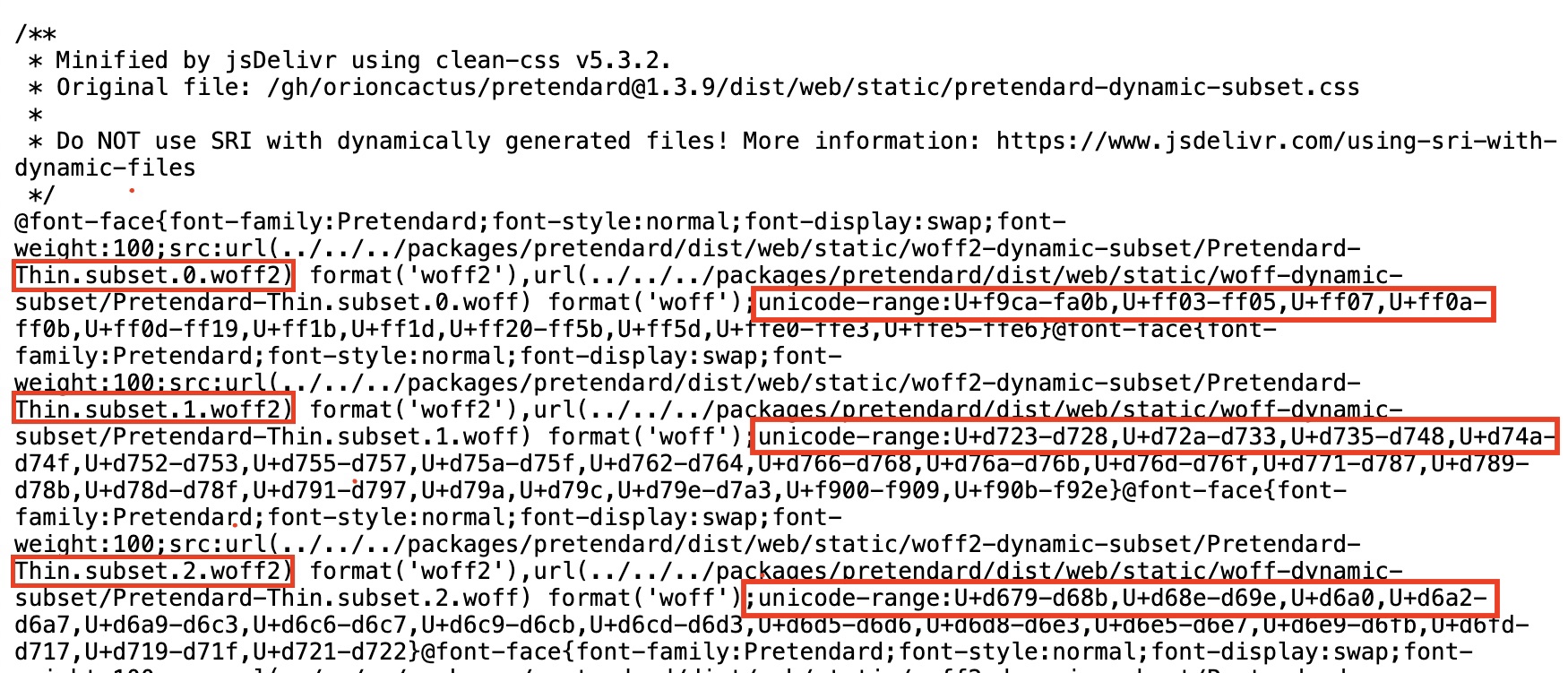 프리텐다드 폰트의 경우 이 다이나믹 서브셋을 CDN을 통해 제공하고 있다. CDN URL에서 제공되는 CSS 파일을 살펴보면, unicode-range 속성으로 정의된 각각의 유니코드 범위와 그에 해당하는 폰트 파일들이 매핑되어 있는 것을 확인할 수 있다.
