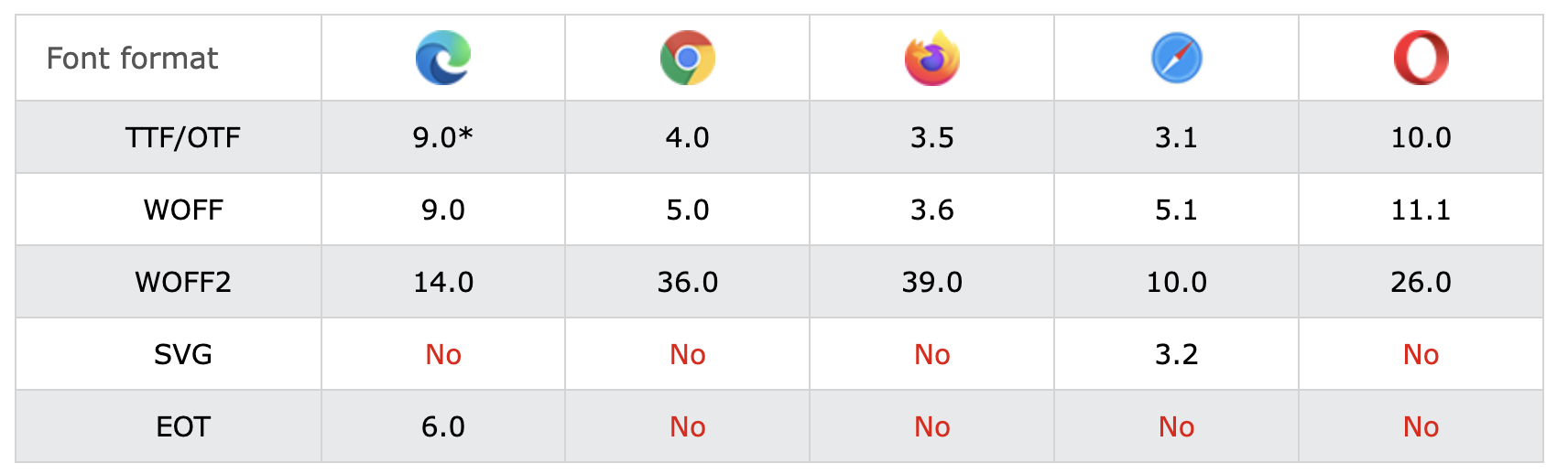 TTF까지 알아보았지만 WOFF가 기본적으로 모든 브라우저를 커버하고 있기 때문에 웹 폰트로는 비교적 작은 용량을 제공하는 WOFF, WOFF2를 사용하면 좋다. WOFF2 경우 Internet Explore는 지원하지 않을 수 있기 때문에 대체 폰트로 WOFF를 사용하기도 한다.