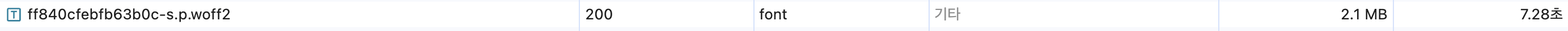 웹 폰트 다운로드 시간이 얼마나 되는지 네트워크 탭에서 확인해보니 7초 정도로 긴 시간이었고, 용량은 무려 2.1MB로 큰 크기를 차지하고 있었다. (이는 네트워크 환경이 좋지 못했을 때 측정했기에 이를 감안해야 한다.) 큰 용량으로 인해 다운로드 시간이 길어졌고 이에 따라 폰트 적용도 늦어지고 있었던 것이었다. WOFF2임에도 용량이 큰 것을 확인할 수 있는데 그 이유는 해당 폰트는 가변폰트이기 때문이다.